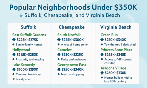 Popular Neighborhoods Under $350K in Suffolk, Chesapeake, and Virginia BeachIf you’re thinking about buying your first home, you might be surprised at how many neighborhoods…